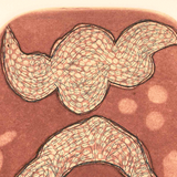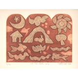 In this majestic work, Bhatt paints a picture of the cosmos - from the oceans teeming with life - to the earthly abode of trees and peacocks - to finally the celestial ether with the shining sun and moon. Recurrent motifs from the artist’s language come together to take us through the three pronged mystery of existence.