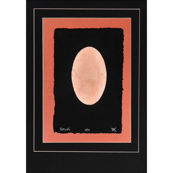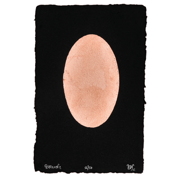 In this new body of work inspired by the timeless magic of the festival of light, I create images of consciousness - primarily with the motif of the Hiranyagarbha, the golden womb / cosmic egg, that is considered the primordial source of creation. The ovoid shape, capable of tremendous meditative power, is rendered in gold, silver and copper foils against a background of black, deep blues and indigos - colours traditionally associated with the dark night of Diwali. Against the darkness of this rich natural colour palette, an inner light emerges…
