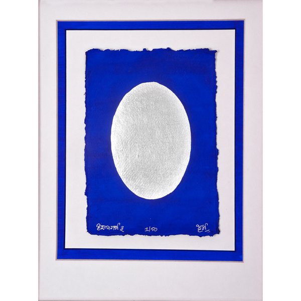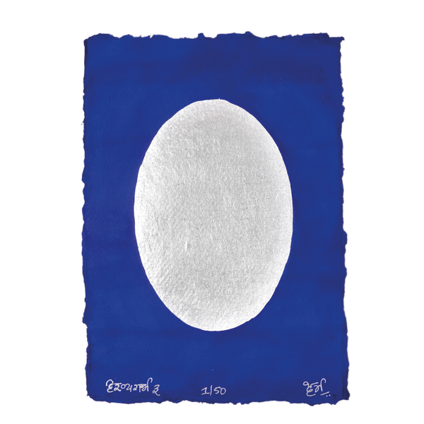 In this new body of work inspired by the timeless magic of the festival of light, I create images of consciousness - primarily with the motif of the Hiranyagarbha, the golden womb / cosmic egg, that is considered the primordial source of creation. The ovoid shape, capable of tremendous meditative power, is rendered in gold, silver and copper foils against a background of black, deep blues and indigos - colours traditionally associated with the dark night of Diwali. Against the darkness of this rich natural colour palette, an inner light emerges…