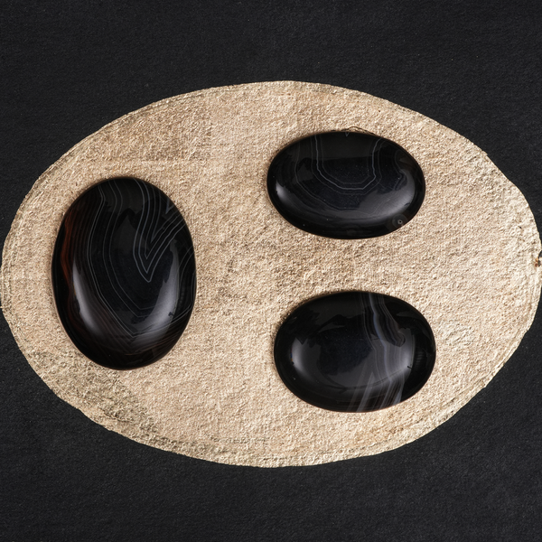 In this new body of work inspired by the timeless magic of the festival of light, I create images of consciousness - primarily with the motif of the Hiranyagarbha, the golden womb / cosmic egg, that is considered the primordial source of creation. The ovoid shape, capable of tremendous meditative power, is rendered in gold, silver and copper foils against a background of black, deep blues and indigos - colours traditionally associated with the dark night of Diwali. Against the darkness of this rich natural colour palette, an inner light emerges…