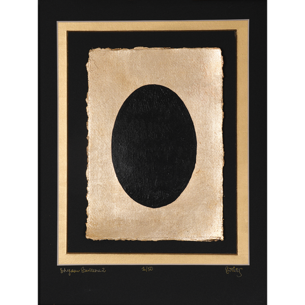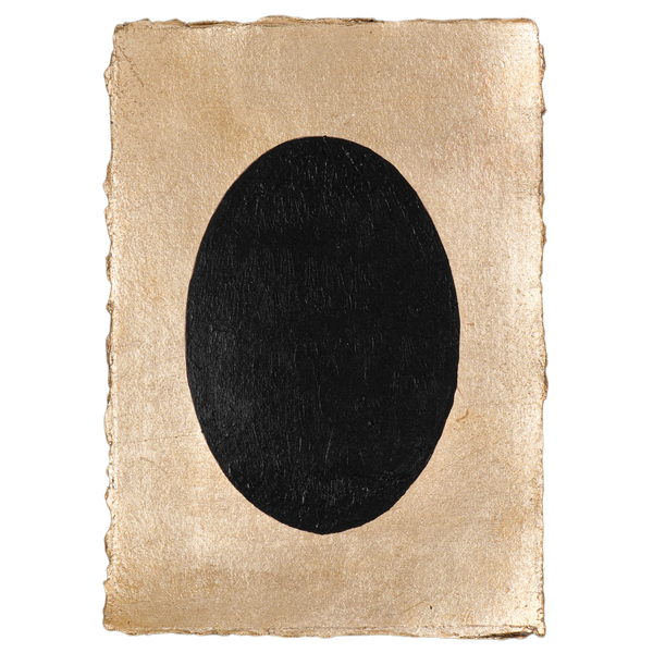 In this new body of work inspired by the timeless magic of the festival of light, I create images of consciousness - primarily with the motif of the Hiranyagarbha, the golden womb / cosmic egg, that is considered the primordial source of creation. The ovoid shape, capable of tremendous meditative power, is rendered in gold, silver and copper foils against a background of black, deep blues and indigos - colours traditionally associated with the dark night of Diwali. Against the darkness of this rich natural colour palette, an inner light emerges…