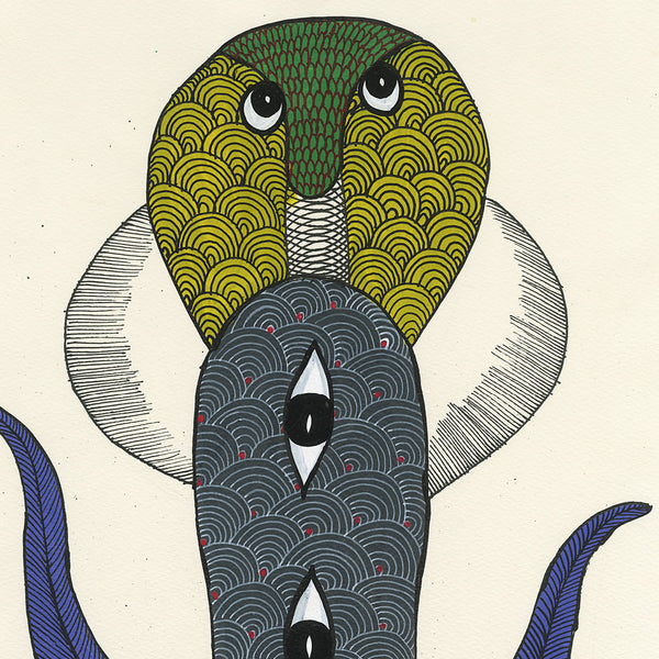 Practiced in Central India, by the community of the same name, Gond Art is one of the most vibrant forms of folk / tribal art today. Gond Art has a very distinct style, but this work further surprises us by its very original depiction of the three elements associated with Shiva: the Shivalinga, the Trishul (trident) and the serpent.