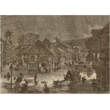 A typical portion of the then-called Native Town is seen here completely overwhelmed by what seems to be a particularly heavy downpour. Sketched in an area that could be virtually anywhere between Kalbadevi and Girgaum, we see the citizens of late 1860’s Bombay struggling to get off the streets to get to where they need to, either by hitching a ride on someone’s back or on a bullock cart, or attempting to continue living their normal daily life, carrying vegetables or water over the flood level, or keeping their warehouse / shop open, like in one instance.
