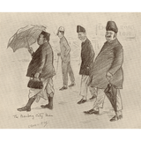 A relaxed approach to the monsoon, as we see a variety of the middle and upper-middle class gentry of Bombay exiting the Charni Road station (the sign board can be seen in the top-right background) on a monsoon day in the early 20th century (dated by the previous owner of this work).