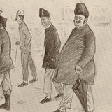 With black overcoats, the three Indian gentlemen in a variety of sizes in the foreground seem to also be in a variety of moods, just about coming out of the railway station. The suited gentleman in the background, possibly a “burra sahib” or an Anglo-Indian, leans out from under the roof shade, smoking seemingly without a care as he waits for a pick-up / Victoria “garri”, indicated by the absence of an umbrella.