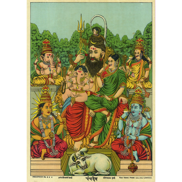 This vintage print from Ravi Varma Press gives us an interesting glimpse of five gods. In the centre, we find the Shiva family, flanked by the Devi, Vishnu, Surya Narayan, and Ganesh (clockwise).